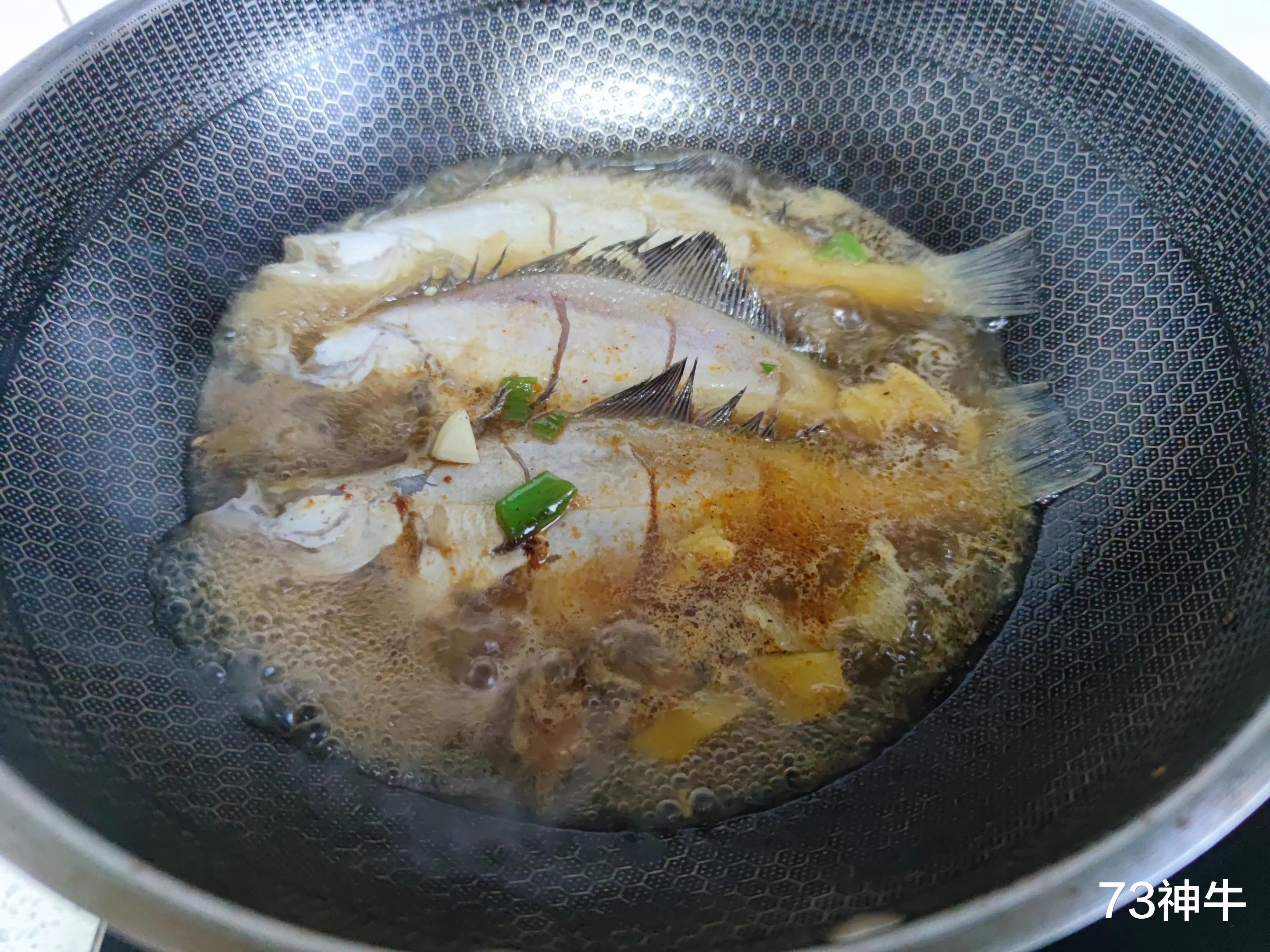 3.锅中入油爆香葱姜蒜和一瓣比较,烹入料酒和一品鲜酱油后添汤,汤汁中加入少许白糖提鲜,汤开后把偏口鱼入锅。
