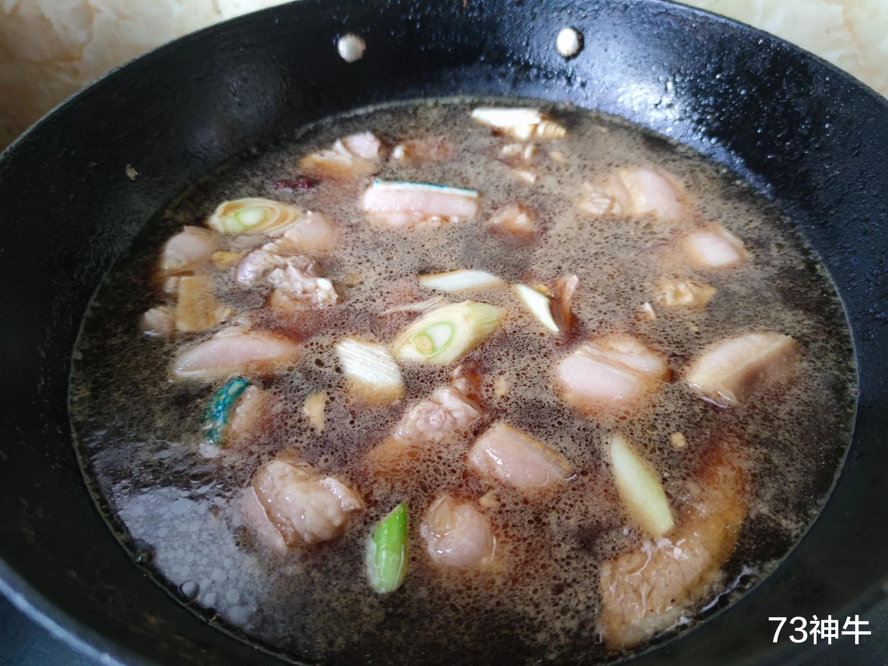 3.锅中入油下入五花肉煸炒出油脂,控出多余的油脂后下入冰糖,冰糖炒化糖汁包裹住五花肉后下入葱姜蒜和一瓣八角跟肉一起炒香,烹入料酒和一品鲜酱油把肉炒上色后添入开水。