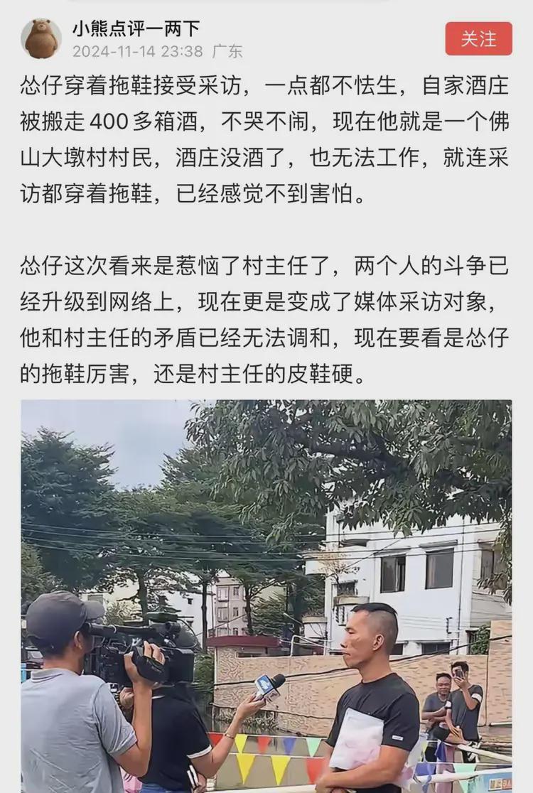 11月14日深夜,有广东网友发帖称,怂仔穿着拖鞋接受采访,一点都不怯生,自家酒庄被搬走400多箱酒,不哭不闹,现在他就是一个佛山大墩村村民,酒庄没酒了,也无法工作,就连采访都穿着拖鞋,已经感觉不到害怕。