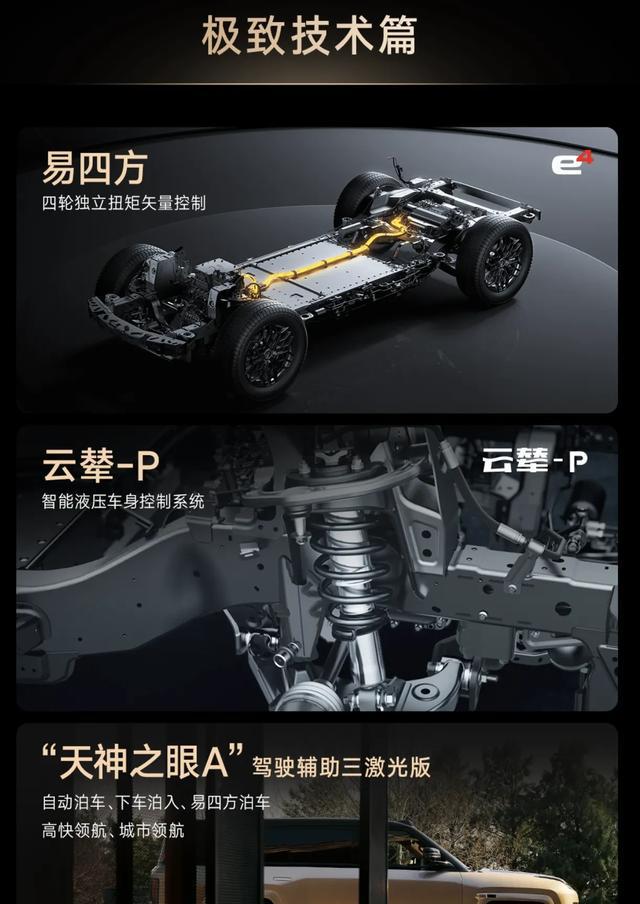 当我们谈及豪华车时,常常也离不开智能科技的讨论。仰望U8L搭载了多项独特的智能科技,体现了这一品牌在技术创新上的努力。它所采用的易四方技术实现了四轮独立扭矩矢量控制,可以轻松应对各种复杂的路况,无论是城市的狭窄街道还是偏远的乡间小路,都能游刃有余。伴随其而来的云辇-P智能液压车身控制系统,能根据实际路况实时调整悬架,确保车辆的行驶稳定性和舒适性。