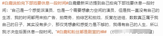 白鹿在采访中透露,拍完下部戏就要休息一段时间啦!消息一出,粉丝们既心疼又支持。白鹿直言自己是感受派演员,需要想象力空间,可这些年一直连轴转,拍广告、拍商务、拍综艺、拍戏,进组一个接一个,真正属于自己的日子少之又少。