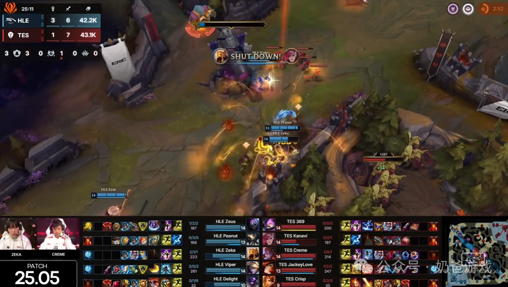 第二个致命失误是9分30秒左右,TES和HLE在上路河道口展开了一波小规模团战,这里导播没有给到画面,但从小地图可以看到,阿罗拉使用QE清了一波兵线后开始往上路靠,沙皇紧随其后用WEQ近身后,逼出了小奶油的W,然后沙皇大招推,阿罗拉在这里用掉了自己的大招,然后直接到F6回城了,沙皇也不深追直接往上路走,配合队友打出了3换0。