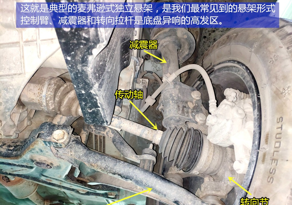 这就是典型的麦弗逊式独立悬架结构,其优点就是零部件数量少,对空间侵占少,使用稳定等。但缺点就是各部件都要承受较大的支撑力,从而某一个球头出现间隙,将会导致异响。