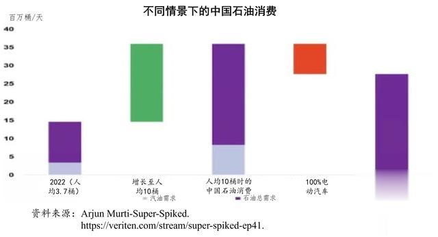 以中国为例,目前人均石油消费为3.7桶,全国相当于约每天消费1500万桶石油。随着中产阶级向每年人均消费10桶石油增加,全国每天的石油消费总量必须达到3500万桶,才能满足中国能源需求的增长。即使实现了100%的电动汽车渗透率(阿琼或我都认为这是不可能的),中国的石油需求仍然每天还有2700万桶。根据标普全球的数据,中国的石油产量为每天410万桶,供需缺口为每天1100万桶,中国必须进口石油才能满足当前的需求。