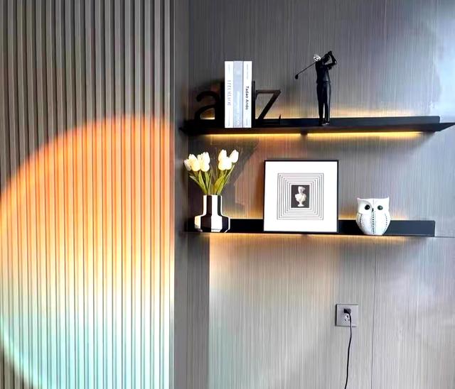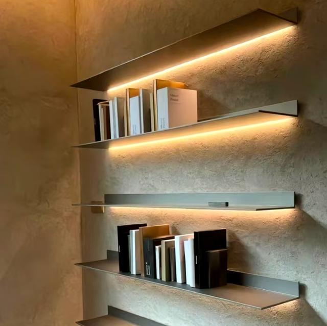 悬浮层板置物架是指通过隐藏式或极简的金属支架支撑来层板,将物品悬浮于空中的支架,不同于传统吊柜的固定布局,使整个空间显得更加通透和轻盈。