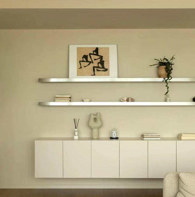 悬浮层板置物架的创新设计,是源于极简风格的趋势流行和设计师对空间的视觉效果追求,使整个空间营造出轻盈而空灵的感觉。