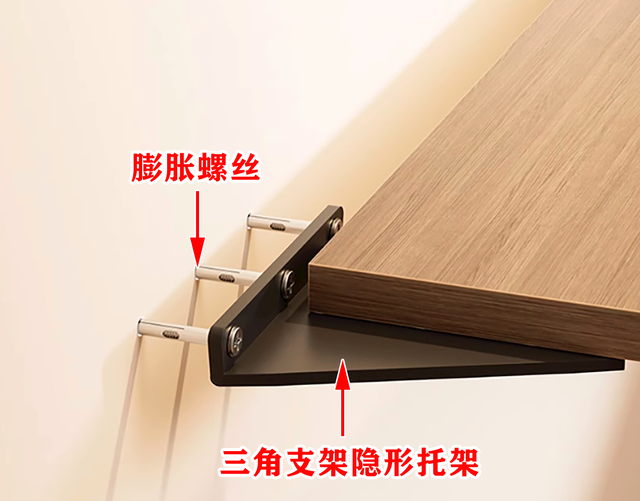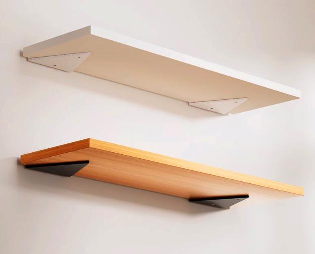 第五款为:三角支架悬浮实木隔板,三角支架底座保证承重效果,在保证实用性同时不影响整体美观。