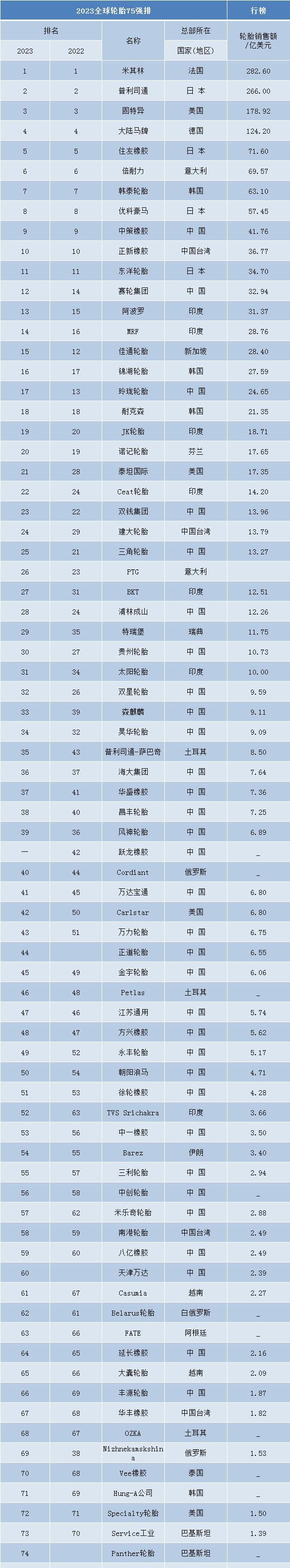 在前8名当中,日本有三家企业上榜,分别是普利司通,住友橡胶和优科豪马;另外法国,美国,德国,意大利,韩国各有一家上榜。