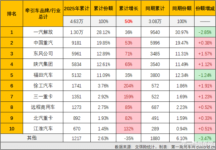 2025年1-2月,牵引车终端市场累计实销4.63万辆,同比累计增长50%,累计销量增幅较1月过后(+12%)扩大38个百分点。