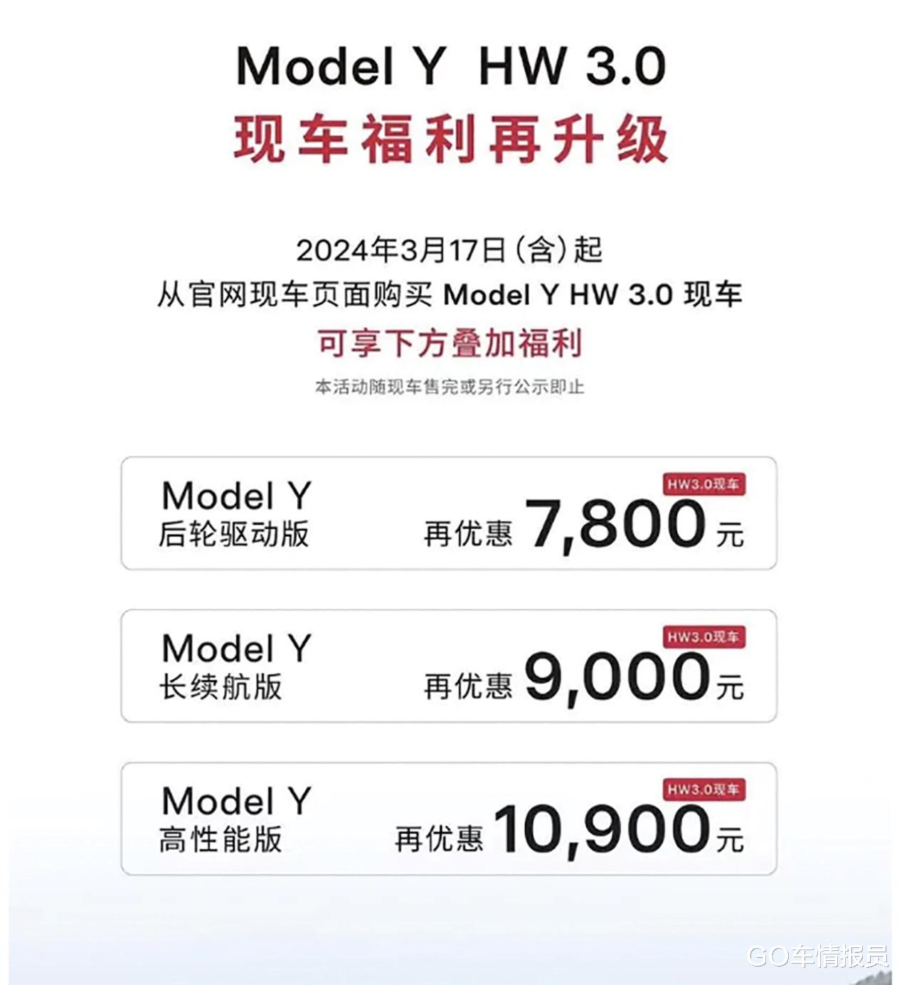 HW3.0版的Model Y现车,最少可以在原有优惠的基础上再优惠7800元,这是后轮驱动版的价格,另外长续航版和高性能版分别降价9000元和10900元。