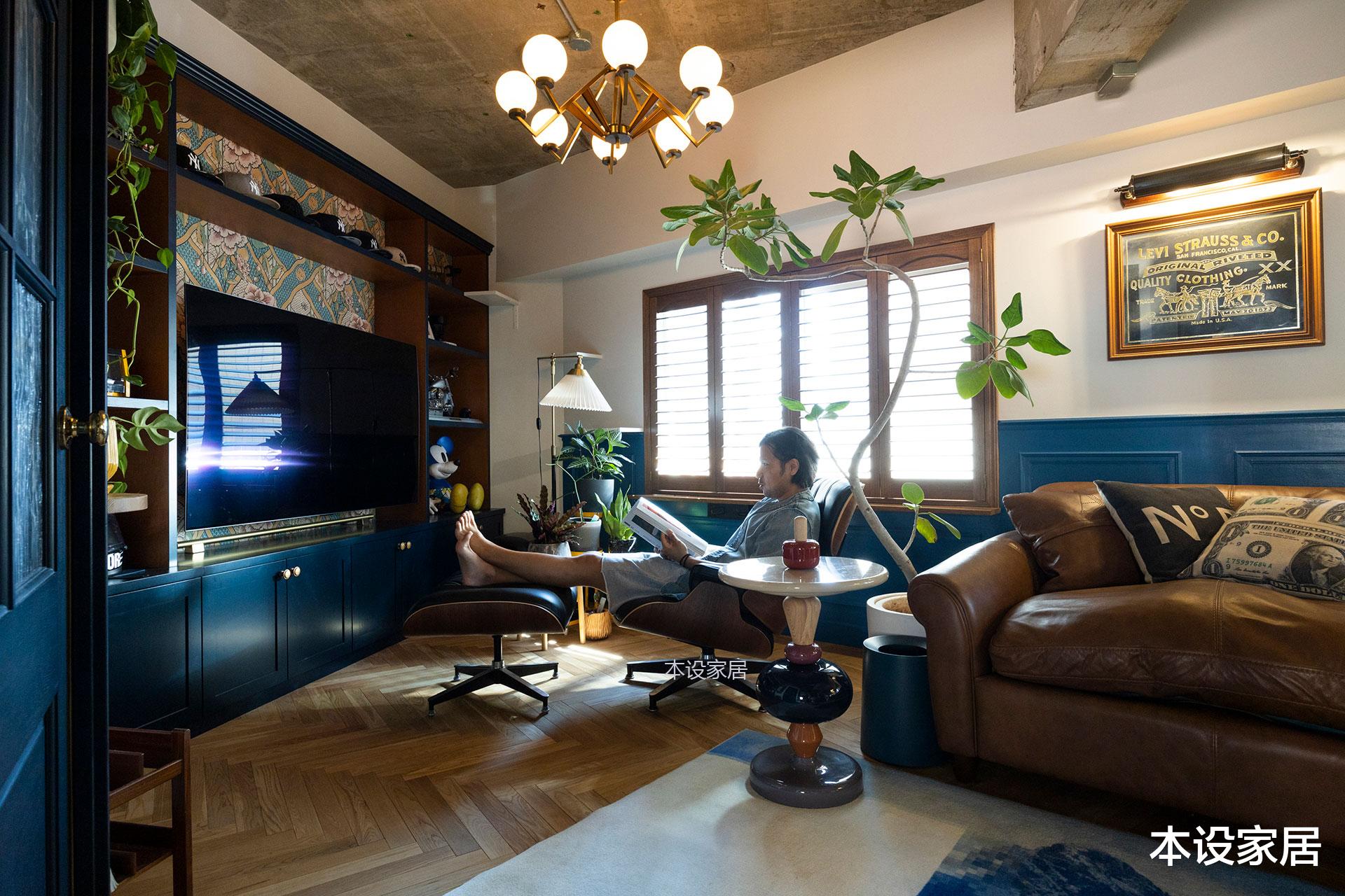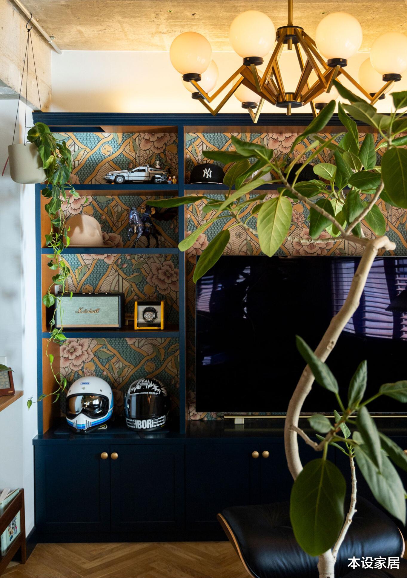 客厅靠角落设置电视墙,有开有合设计的海军蓝储物柜,满足不同物品的储物需求,而背墙的壁纸大有来头,来自Gucci,搭配欧式吊灯,彰显时尚气息。在绿植的点缀下,增添一份活力,也让这个角落成为一道美景。