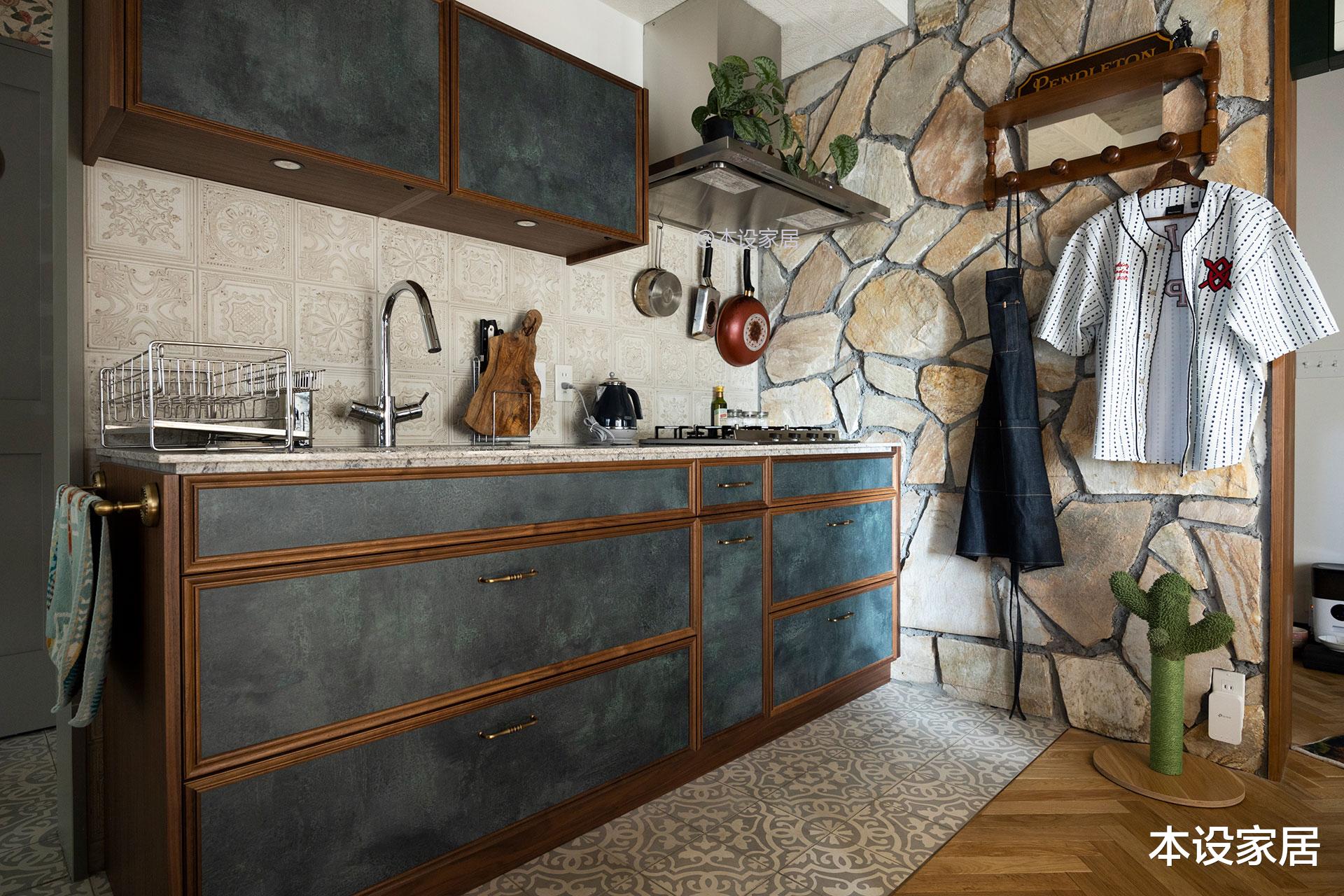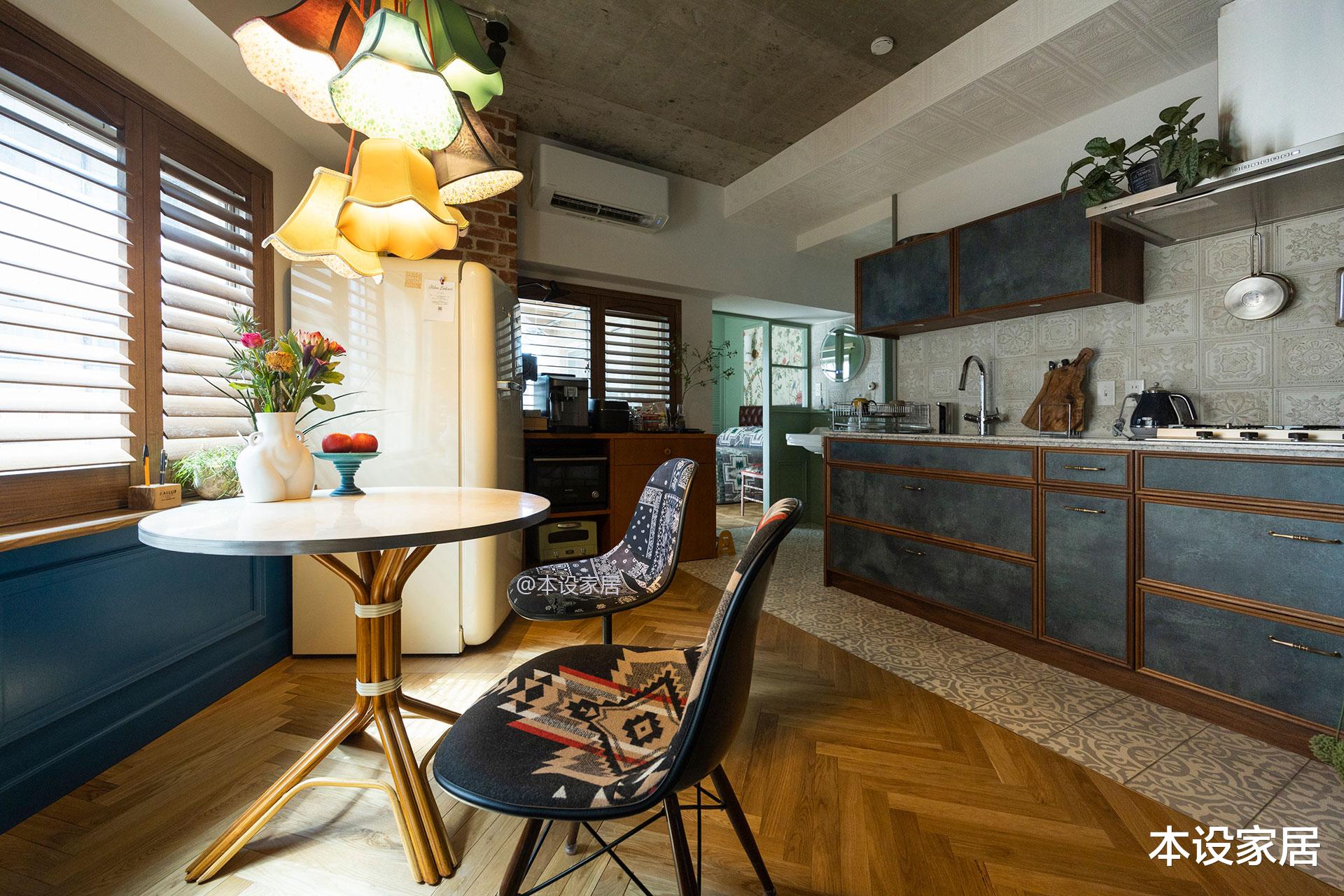 餐厅的对面是“一”字型的开放式厨房,虽然看起来很迷你,但一个人使用足够完美实用,蓝灰色和柚木色组合的储物柜,收纳强大,颜值也颇高,搭配米白色的复古墙砖,真是精致又清新!