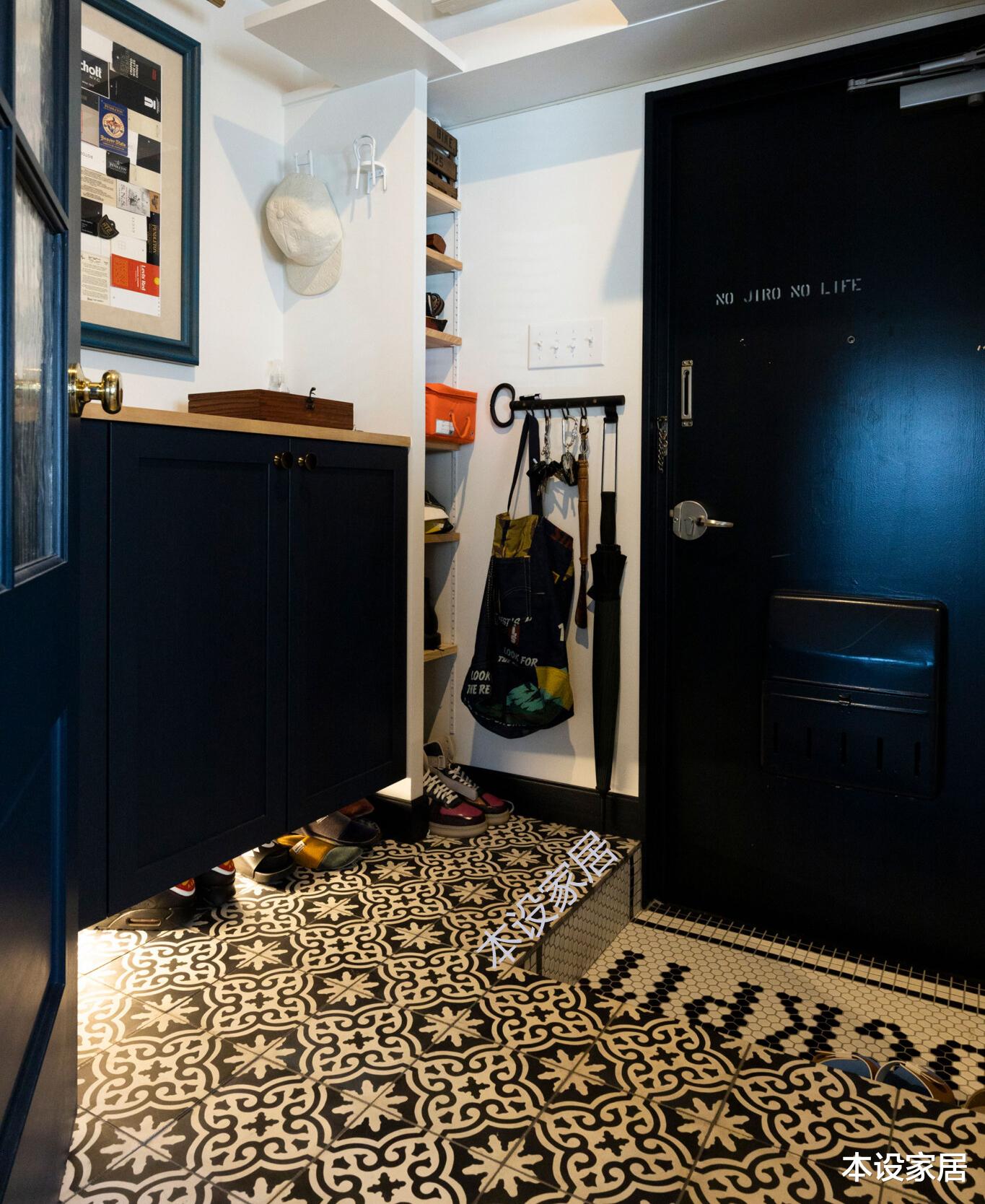 右边靠墙安装一组海军蓝的悬空储物柜[入户门改同色],满足进出门的鞋靴收纳需求,而雨伞、包包,以及一些杂物都收拾的整齐有序,由此可以看出他是一个精致又爱干净的男生。
