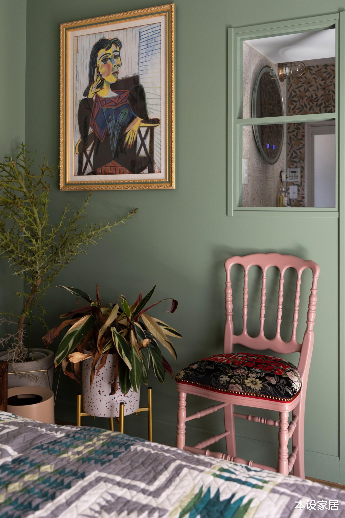 粉绿色的墙面漆清新雅致,粉红色的单人椅和床头背景墙的植物壁纸都是来自Gucci,作为撞色搭配,在绿植和装饰画的点缀下,让空间显得活泼而不跳脱。