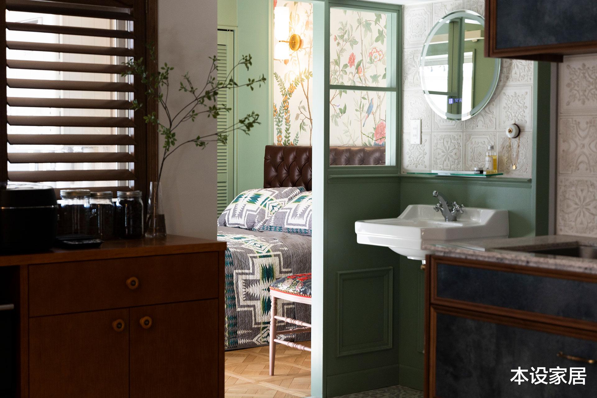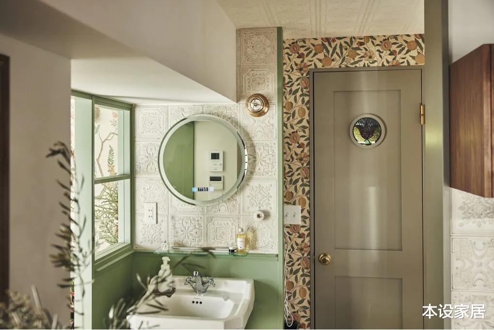 不同花色的复古墙砖,完美契合了卫生间的混搭基调,定制的白色洗漱台,搭配风绿色漆,打破了空间的呆板,更显灵动艺术。