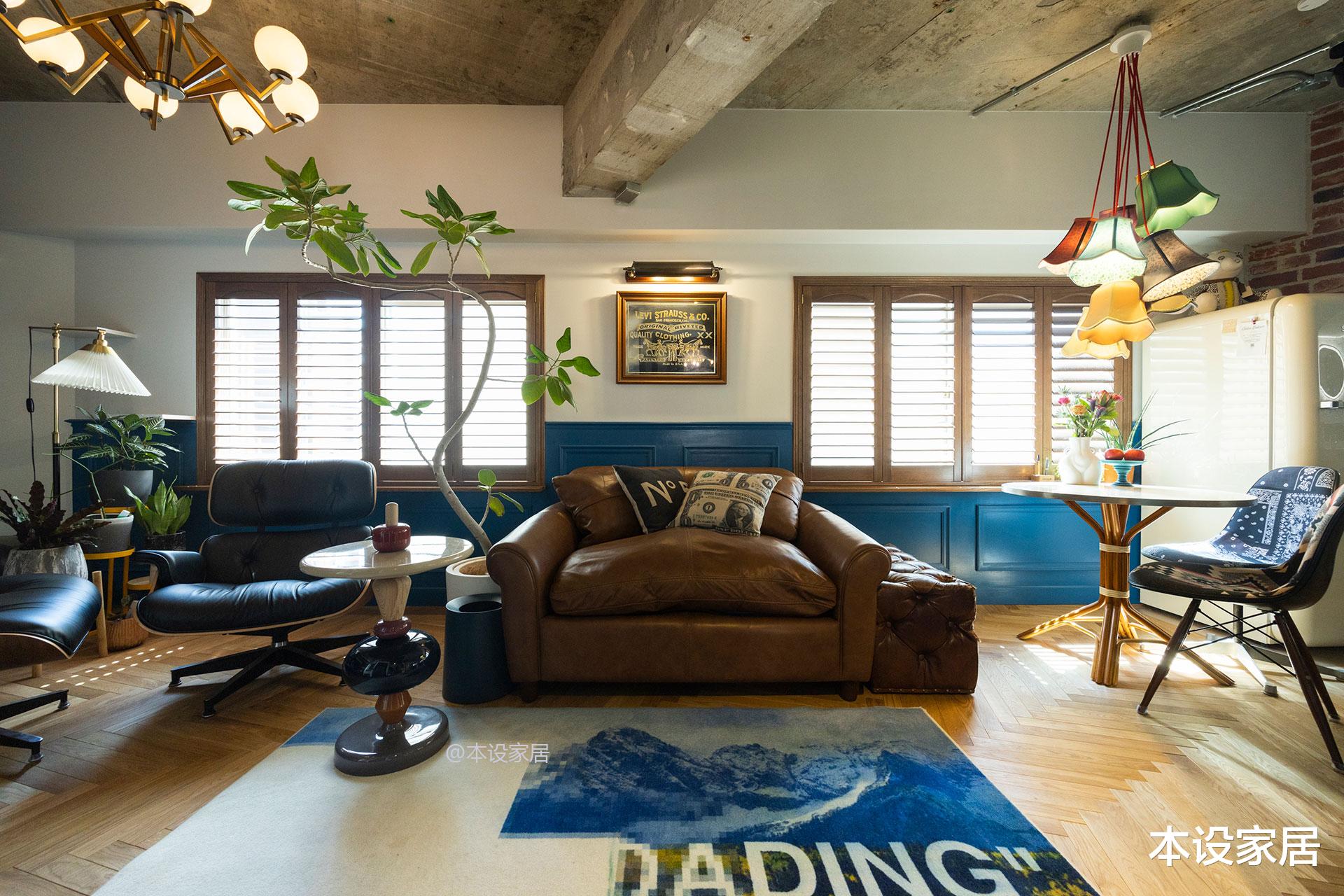 通过玄关是一个集客厅、餐厅和厨房的大空间,地面铺设“人”字拼橡木地板,墙面做蓝色+白色分段处理,天花保留原有的混凝土结构,两扇玻璃窗户引进充足的采光。