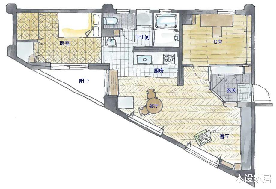 3.客厅、餐厅和厨房布置在三角形大空间里,有扩大室内空间的视觉感。