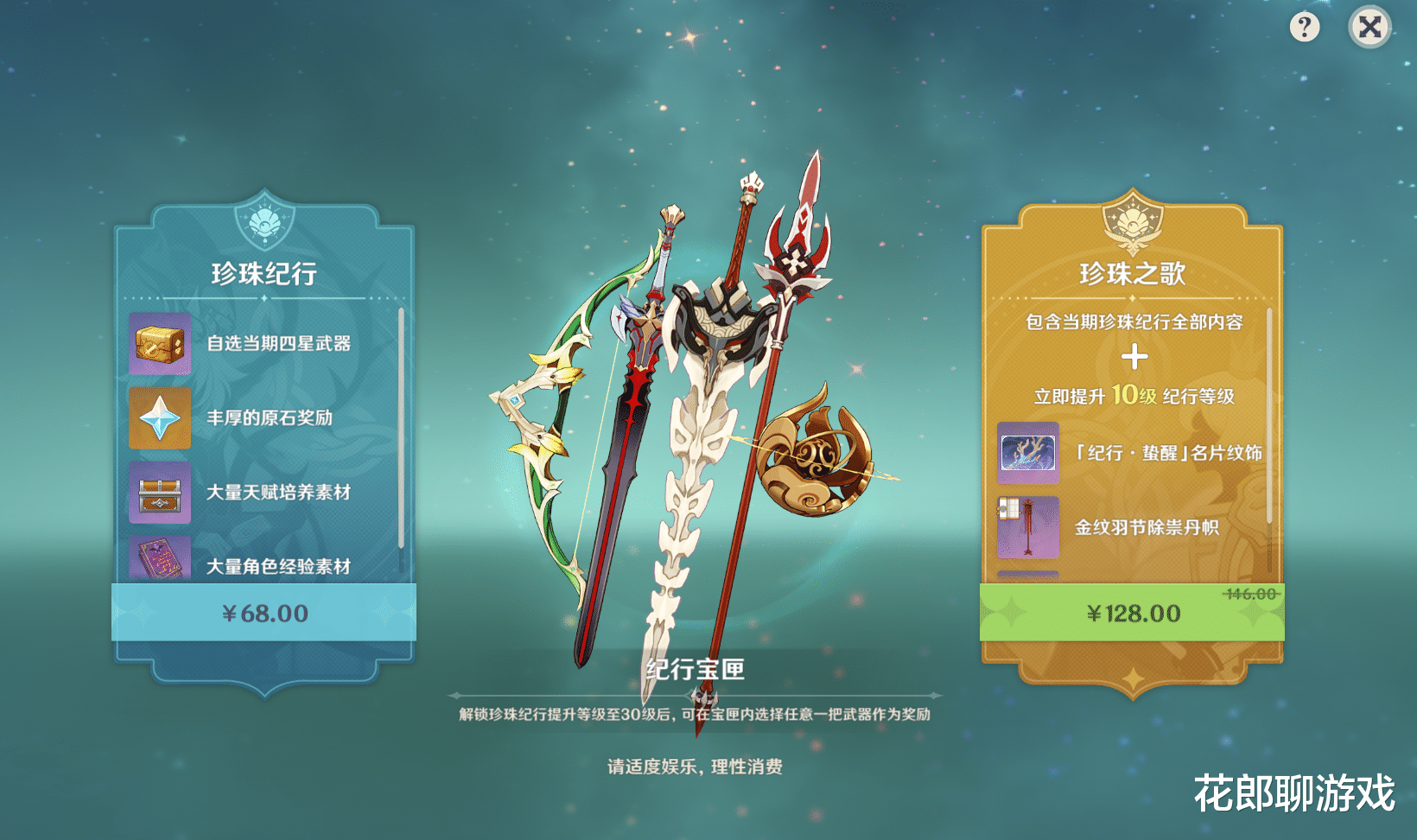 那么,在历经14个版本之后,我们还有必要为了纪行武器,每个版本花个68或者花个128去氪大月卡吗?接下来花郎就和小伙伴们聊一聊,关于纪行宝匣武器当前的泛用性和我个人的一些看法。