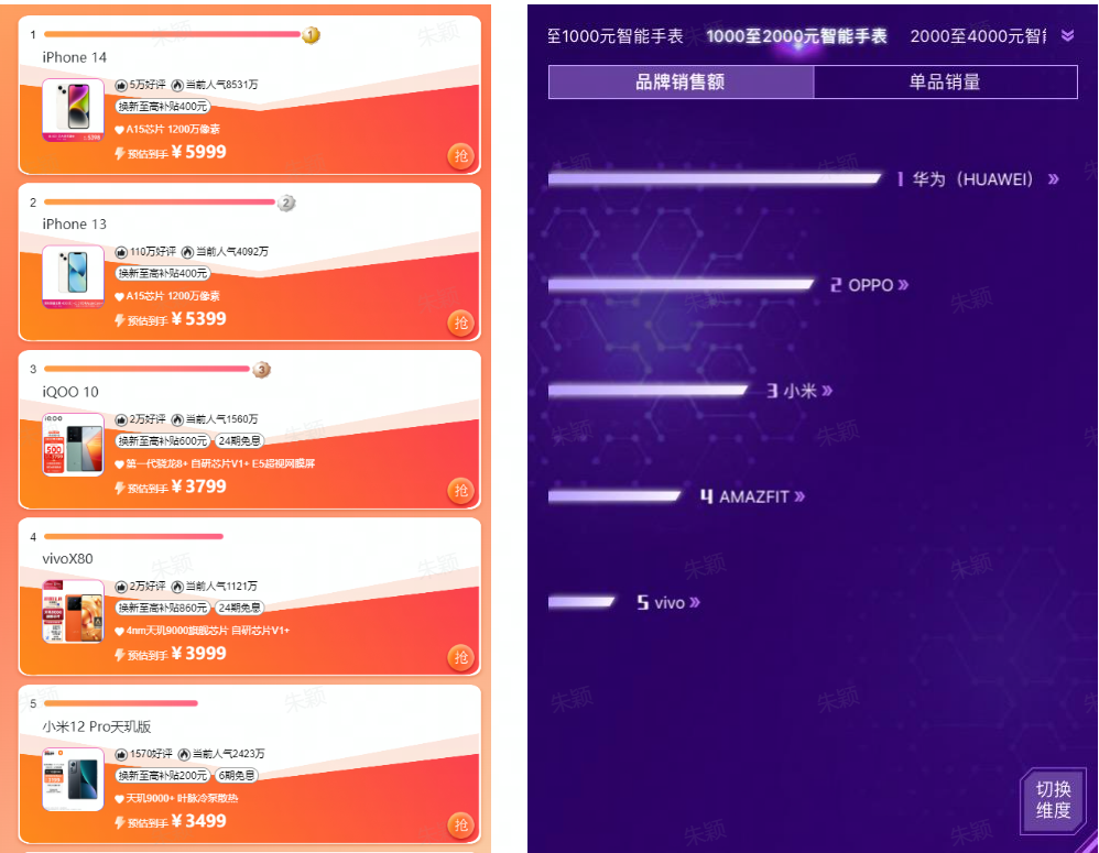 在销量榜上排名首位的华为,双十一期间数款产品热销,其中要数华为 WATCH GT3的关注度最高。它采用圆形表盘设计,搭配多种配色和材质的腕带,将运动时尚属性拉满,日常使用能够支持100多种运动模式,并可以通过运动状态监测及时了解身体状况。再加上TruSeen5.0+心率监测技术带来的心率监测功能和升级后的AI算法,既能够在静止状态下带来精准的心率、血氧监测,为日常生活或运动报价护航。