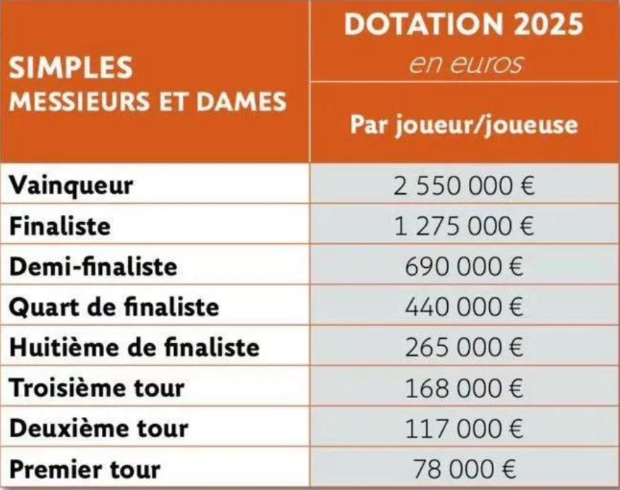 今年的法网总奖金比2024年增长了5.21%,达到了5635.2万欧元,折合成人民币更是高达4.677亿,创下了历届法网总奖金之最。