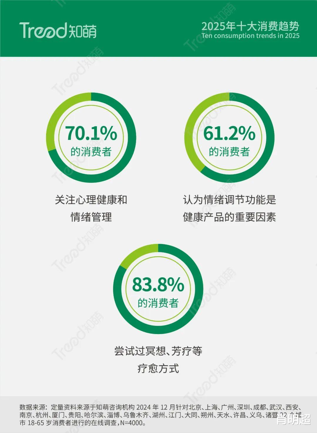 知萌咨询机构发布的《2025中国消费趋势报告》中提出“悦养身心”趋势,指出消费者愈加关注身体的全面健康与愉悦体验,积极探求身心灵的和谐平衡,致力于将传统养生文化融入现代生活,寻求多样化的养生方法,并期待养生过程充满乐趣和满足感,从而实现健康生活的便捷、高效和愉悦。
