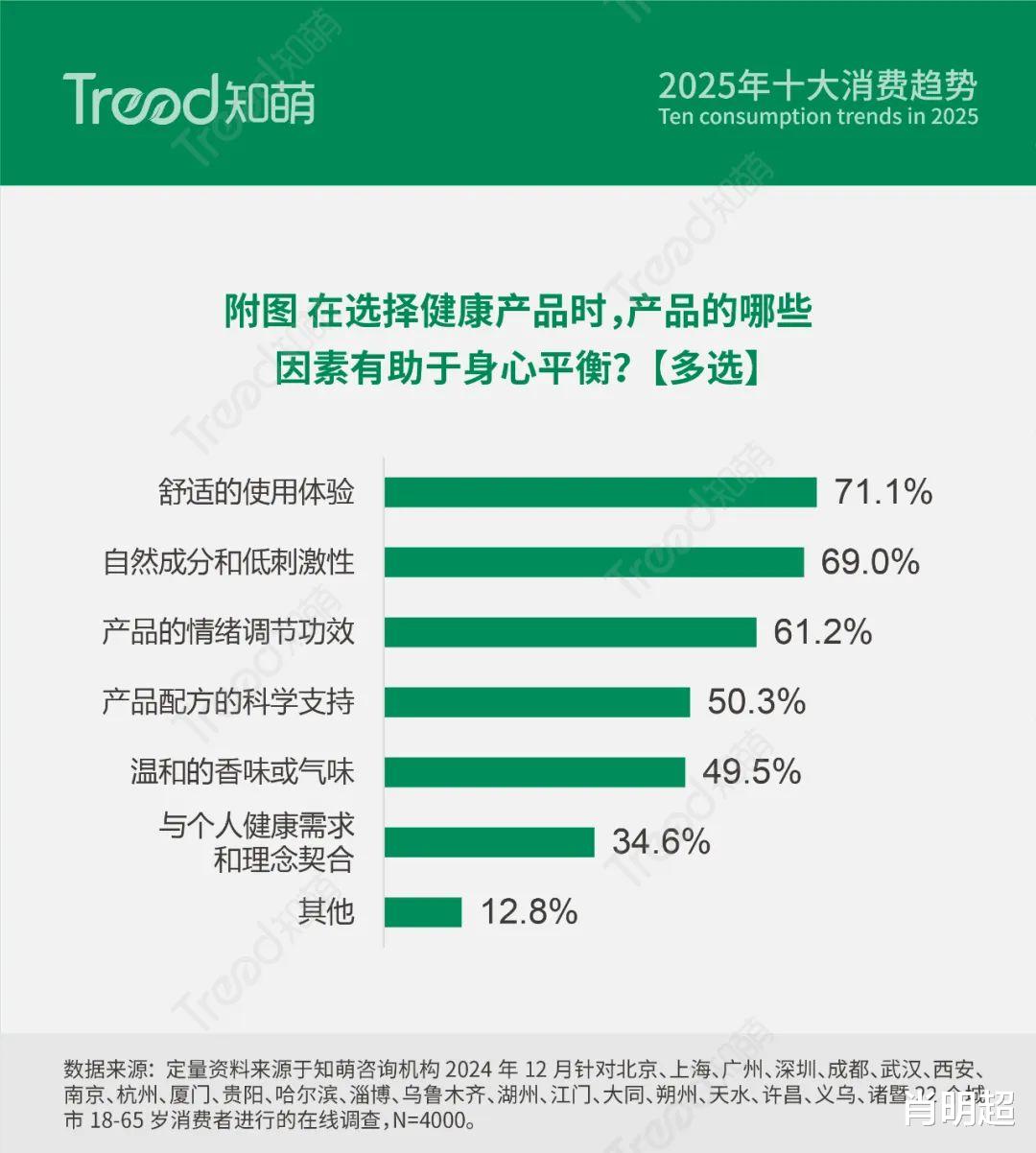 在健康产品选择上,消费者的需求已不再局限于基本功能,而是追求一种愉悦的养生体验。知萌趋势调研显示,在选择健康产品时,71.1%的消费者认为舒适的体验有助于身心平衡,69.0%的消费者认为自然成分和低刺激性有助于身心平衡。因此,舒适的体验和低刺激性成分成为消费者的首要关注点;其次,具有情绪调节功能的产品和温和的香味,不仅有助于身心平衡,也体现了健康消费与情感需求的深度融合。