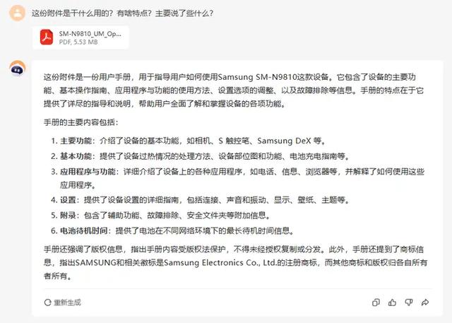 可以看到,通义千问的表现最好,回答的最丰富,而且还猜出了手机属于Galaxy Note系列的一个型号。kimi次之,百小应再次之。文心一言则是答非所问,根本没有读出文档内容。