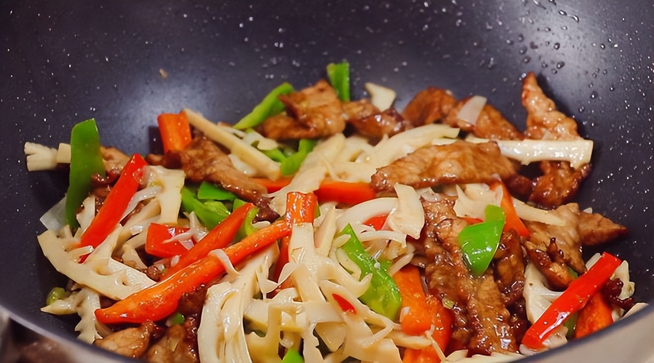 回到家后,小兰开始动手做一道特别受欢迎的菜——双椒嫩笋炒肉片。