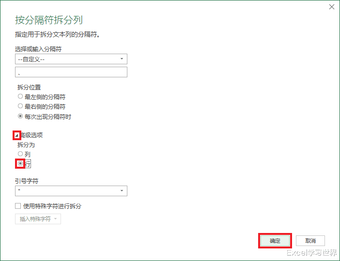 4. 在弹出的对话框中点开“高级选项”--> 选择“行”--> 点击“确定”