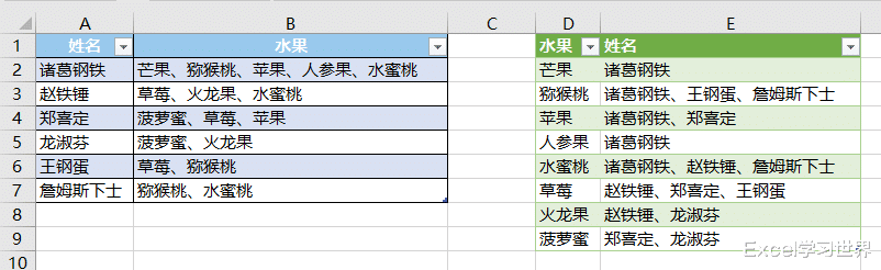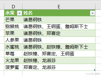 需要依此构建另一个表,按水果分类,列出每种水果有哪几个人购买,便于给不同的供应商看。