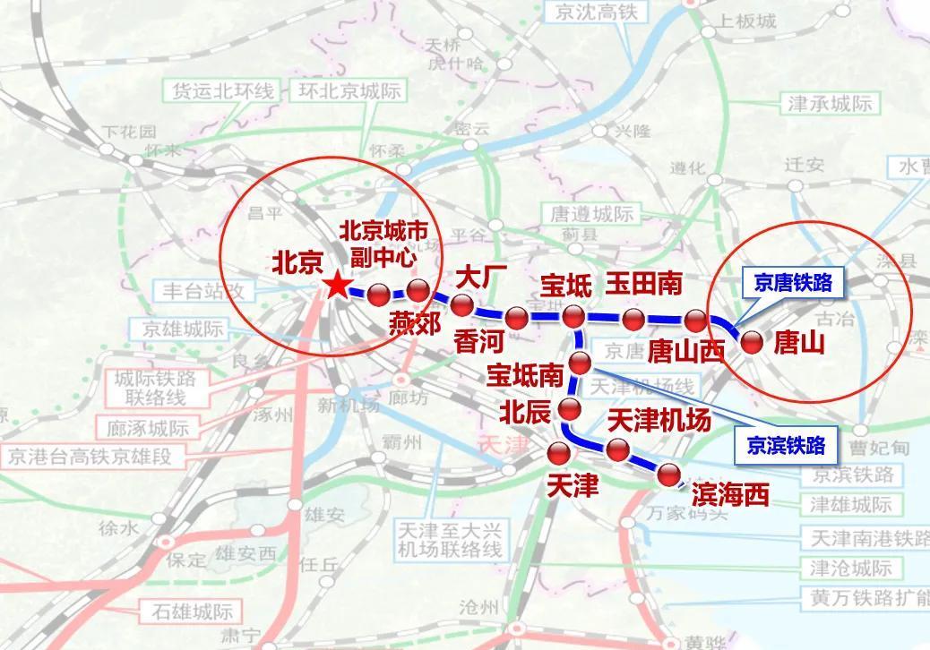 这次同步开通的还有京滨城际铁路宝坻至北辰段。京滨城际铁路与京唐城际铁路北京城市副中心至宝坻段共线共站,线路从宝坻站向南引出,经天津市宝坻区、武清区、北辰区、东丽区、滨海新区,接入天津至秦皇岛高铁滨海西站。
