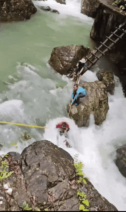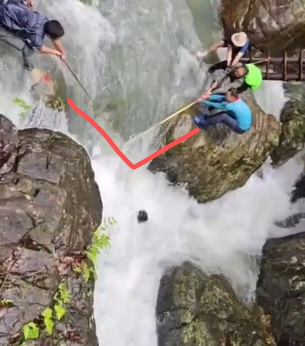 最后,岸上的同伴也束手无策,这位红衣服的男子和戴帽子的女生一起跌入了水流中,从此和队伍失联了。