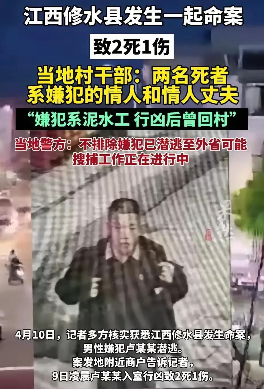 2025年4月9日凌晨3时,江西省九江市修水县义宁镇罗桥路一处民宅内,48岁的泥水工卢某某手持利刃,将情人陈某及其丈夫王某砍杀于睡梦之中。鲜血喷溅的房间里,高三女生小陈(化名)因起夜撞破惨剧,背部遭砍一刀后侥幸逃生。案发后,卢某某骑牌照为赣G2436C的摩托车向湘鄂交界地带疯狂逃窜,截至4月11日仍未落网。