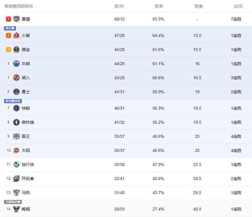 西部两强力压骑士雷霆还是排在第一位,他们60胜12负的成绩比骑士还要好,现在看起来这个赛季他们很有希望拿到65场胜利呢!而火箭稳居第二。