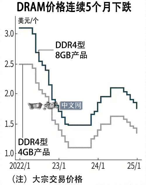 报道称,2025年1月份指标性产品DDR4 8Gb批发价(大宗交易价格)为每个1.75美元左右,容量较小的4Gb产品价格为每个1.34美元左右,皆较前一个月份下跌6%,皆为连续第五个月下跌。其中8Gb产品创1年10个月来(2023年3月以来)最大跌幅、4Gb产品创1年9个月来(2023年4月以来)最大跌幅。