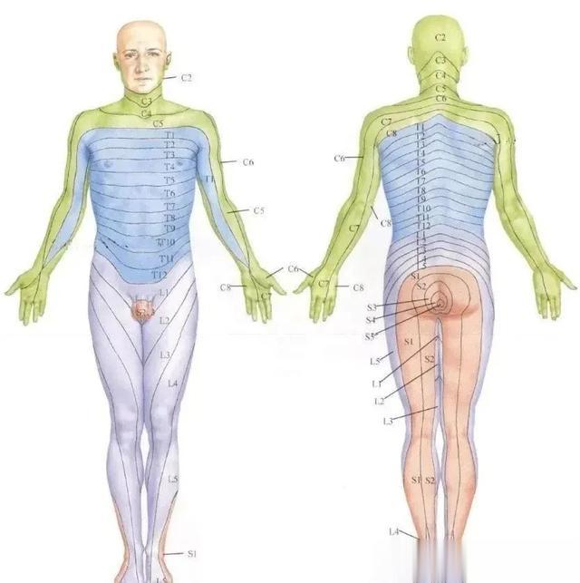 就像下图这样,神经的分布是分区域的。如果颈椎病变的位置较高,压迫的就不是掌管手的神经,可能仅有颈肩部或大臂部的疼痛、麻木、无力,而不会有手的麻木。