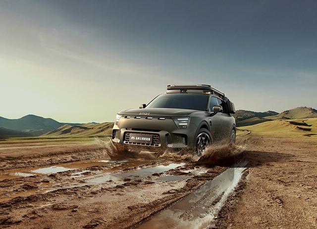 从侧面看,精灵5号的整体轮廓比较方正,同时D柱十分宽大,看起来很有厚重感,这也是大部分硬派越野车共通的特点,不过它还采用了目前电车惯用的隐藏式门把手以及低风阻轮圈,以及无边框车门,而且D柱上的LOGO是可以发光的,以此来表明自己电动化的身份。至于车尾部分,整个尾部的设计是和前脸相互呼应的,尾灯样式与前大灯组别无二致,底部是宽大的后包围,再次凸显了它的野性基因。尺寸方面,精灵5号的长宽高分别是4705/1920/1705mm,别看尺寸在中型SUV里面并不突出,但它的轴距却达到了2900mm,堪称越级。