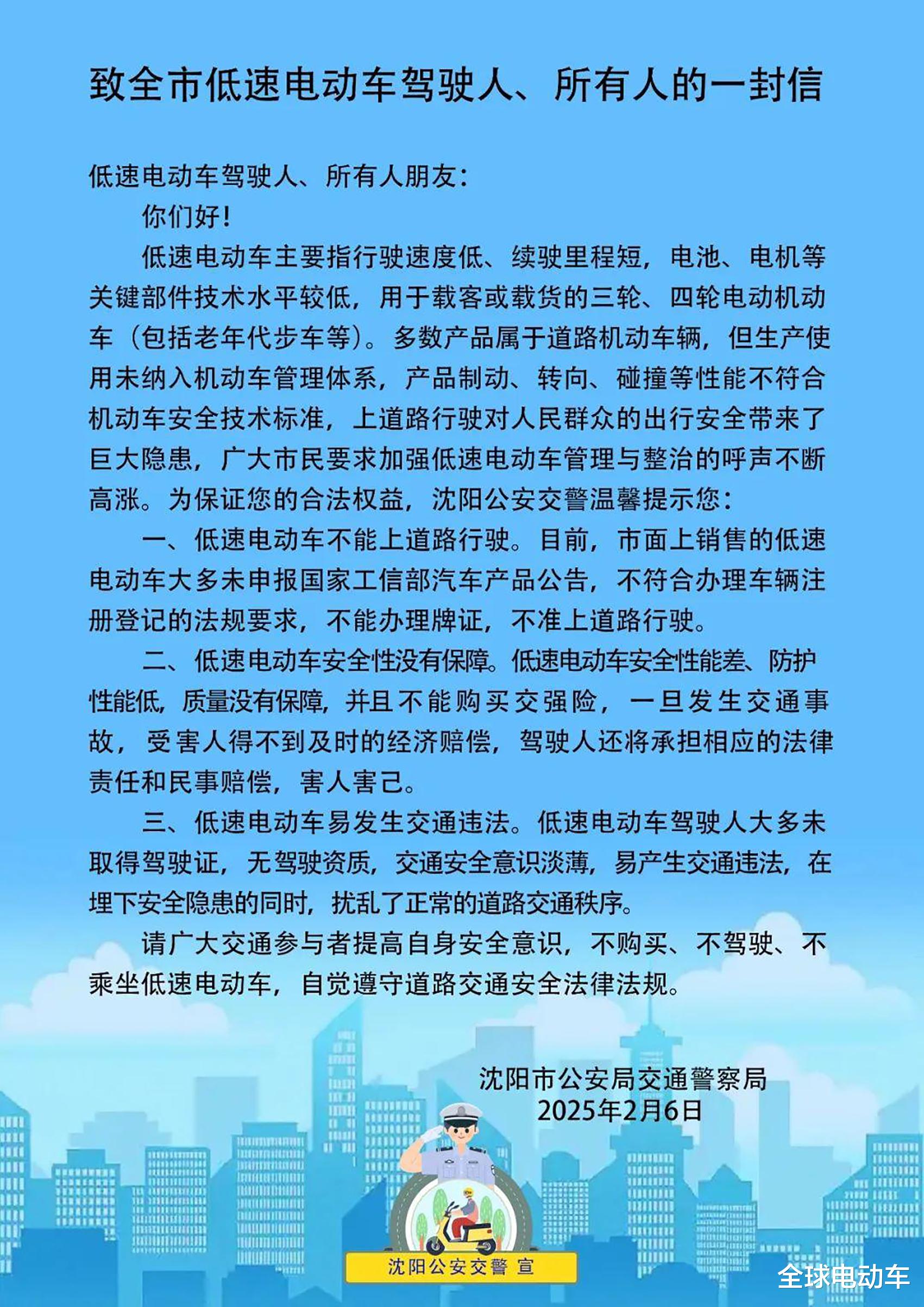 但2025年2月份沈阳市的交警部门就发布全面禁止低速电动车的一封信,要求广大交通参与者提高自身安全意识,不购买、不驾驶、不乘坐低速电动车,自觉遵守道路交通安全法律法规。