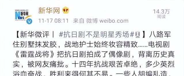 新华网痛批:“对历史缺乏敬畏,抗日剧不是明星秀场!”