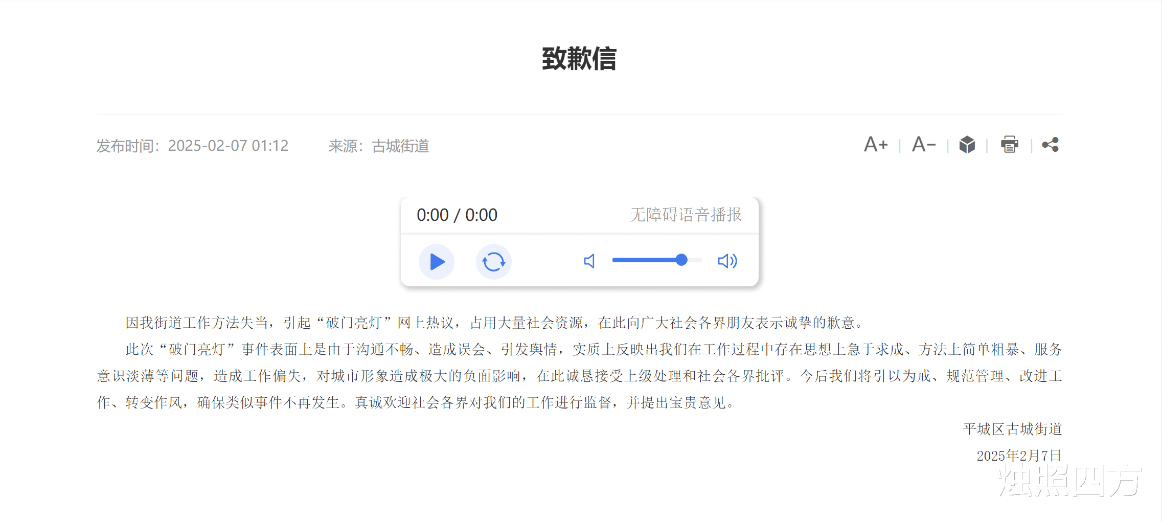 2月7日凌晨,平城区古城街道在大同市平城区人民政府官网发布《致歉信》,就近段时间引发舆论关注的“破门亮灯”事件表达歉意。