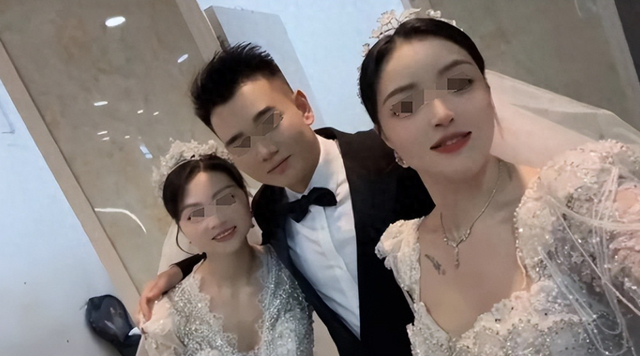 这张照片一出来,可把网友们给看傻了。新郎穿着笔挺的西装站在中间,左右两边的新娘都穿着雪白的婚纱,还都亲昵地挽着他的胳膊。要不说这是婚纱照,别人还以为是哪个电视剧的剧照呢。