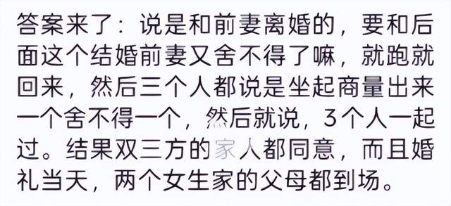 后来听知情人说,这个李丽对前夫感情特别深,离婚后一直放不下。听说前夫要结婚了,死活要参加婚礼,还说要不就三个人一起办。更让人惊讶的是,新郎居然答应了,现女友王芳也没反对。