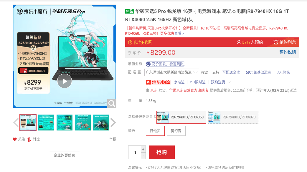 华硕天选5 Pro锐龙版则是首发AMD锐龙9 7940HX处理器,采用Zen4架构和5nm制程工艺,兼备强大性能与出色能耗比。拥有16核心32线程,最高加速频率达到了5.2GHz,配备8GB GDDR6大容量RTX4060,拥有140W满性能。支持光追和DLSS 3.5技术,不仅能够大幅度提高沉浸感和真实感,还可以在保证画质的前提下让游戏画面更加流畅。在京东消费者评价中,我们也可以看到华硕天选5系列拥有99%的好评,消费者对于整机的设计、性能、屏幕都有着超高评价。