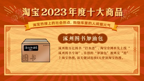 淘宝购物车里,同样装着公众对公共事件的关切。入选淘宝2023年度十大商品的涿州图书加油包、“玲龙一号”核能充电宝即是例证。