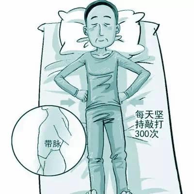 敲打带脉“带脉”有“总束诸脉”的作用,经常敲击能提高排毒能力,改善便秘。腹部“游泳圈”,正是中医“带脉”所绕之处。方法很简单:每晚睡觉前躺在床上,手握空拳,轻捶自己的腰部两侧,每天坚持敲打300次。需要注意的是,敲击时用力并不是越大越好,以身体能承受为宜。