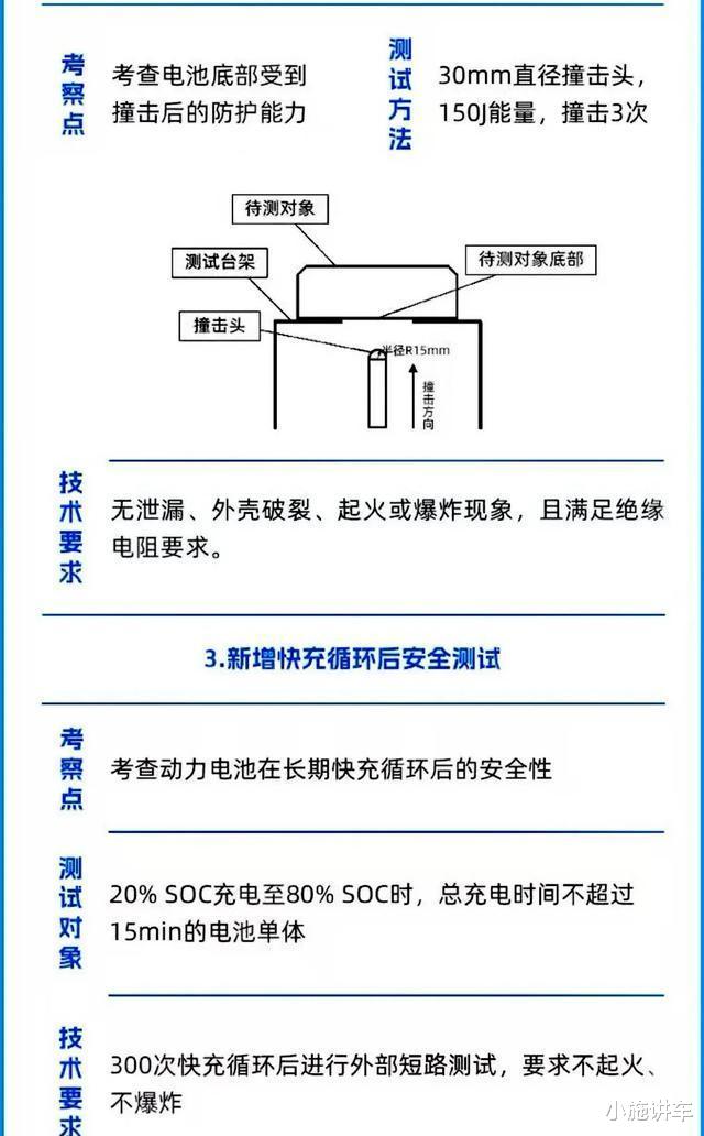 这新国标,到底“新”在哪儿?简单来说,就是三大测试,一个比一个狠:热扩散测试,直接杜绝“火苗苗”;底部撞击测试,模拟底盘被“蹂躏”;快充循环后短路测试,考验电池的“抗压能力”。