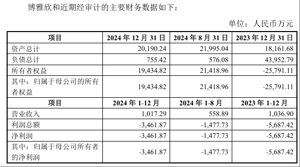 博雅欣和于2014年成立,主营业务为抗感染类、糖尿病类、心脑血管类药品的研发、生产和销售。从披露数据看,博雅欣和2023年、2024年归母净利润分别为-5687万、-3462万元,已连续亏损2年。