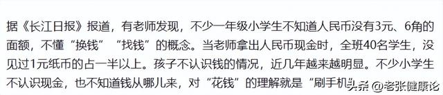 之所以这样笃定,是有官方媒体发布过一篇关于小学生不认识现金的文章,如今的小朋友认为出门付钱只需要一部手机,手机里就有钱。