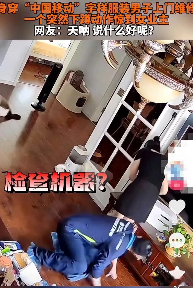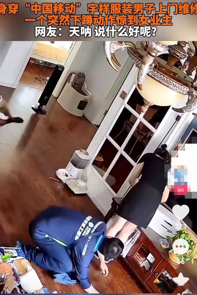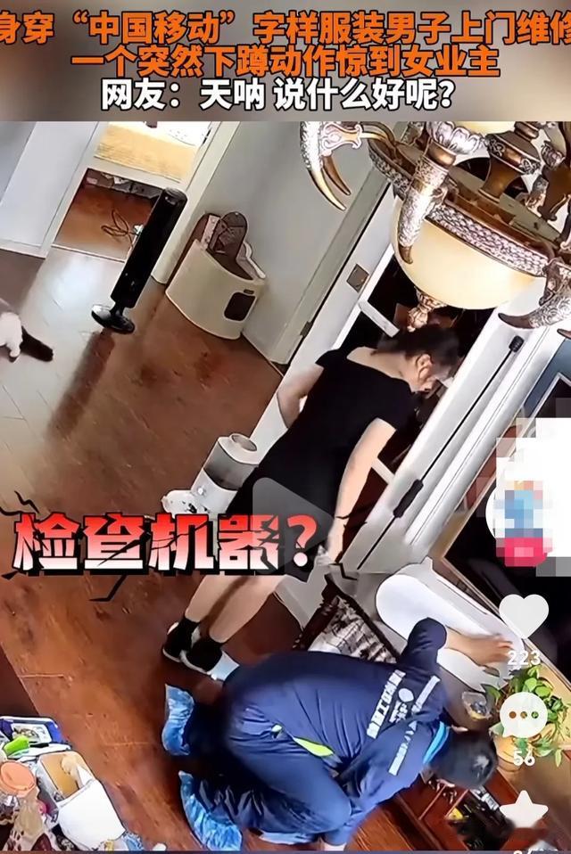 女业主穿着条挺漂亮的黑色连衣裙,那维修工,穿着中国移动的工作服,看着挺正规的。