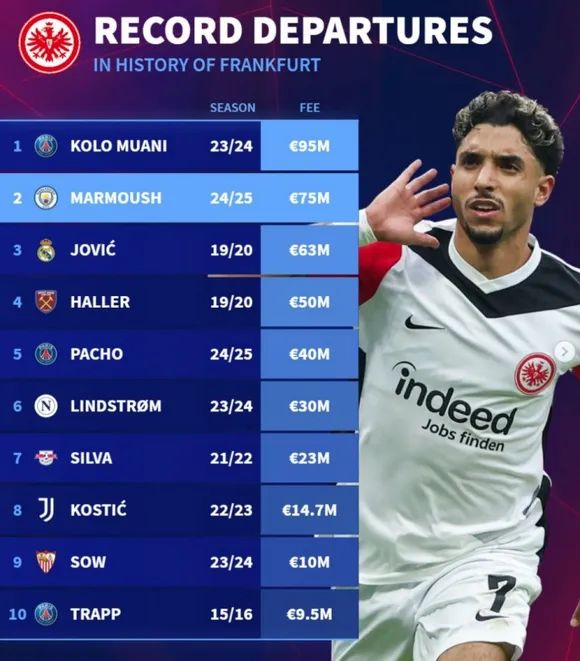 此前法兰克福出售的最贵球员是科洛-穆阿尼,2023年夏天以9500万欧加盟大巴黎。第二贵是今年冬窗7500万欧加盟曼城的马尔穆什。此外约维奇(2019年6300万欧加盟皇马)、阿莱(2019年5000万欧加盟西汉姆)、帕乔(2024年4000万欧加盟巴黎)。